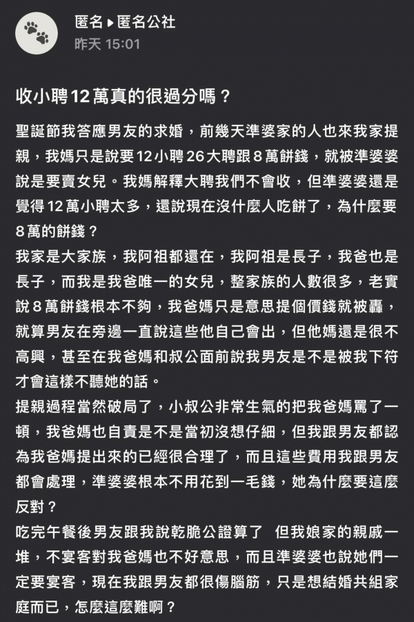 『12萬小聘跟8萬餅錢這不是基本的嗎?這樣都嫌多的話,那你以後的問題也會更多才對,這個婚要不要結就要三思了』