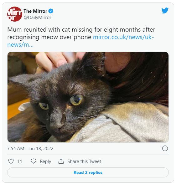 電話掛斷後,瑞秋卻依然掛心此事,幾小時後又致電追問,新收編的「浪貓」是否為黑色公貓,其中一隻後腿是否有一塊白色斑點,2項特徵竟都相符。