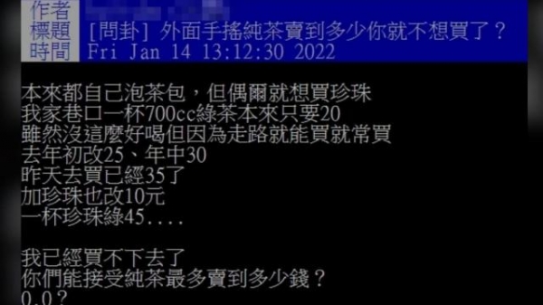 ▼原po實在無法接受這樣的價格,他不禁抱怨「我已經買不下去了」。他很好奇大家對於手搖飲價錢的底線,於是詢問網友:「你們能接受純茶最多賣到多少錢?」