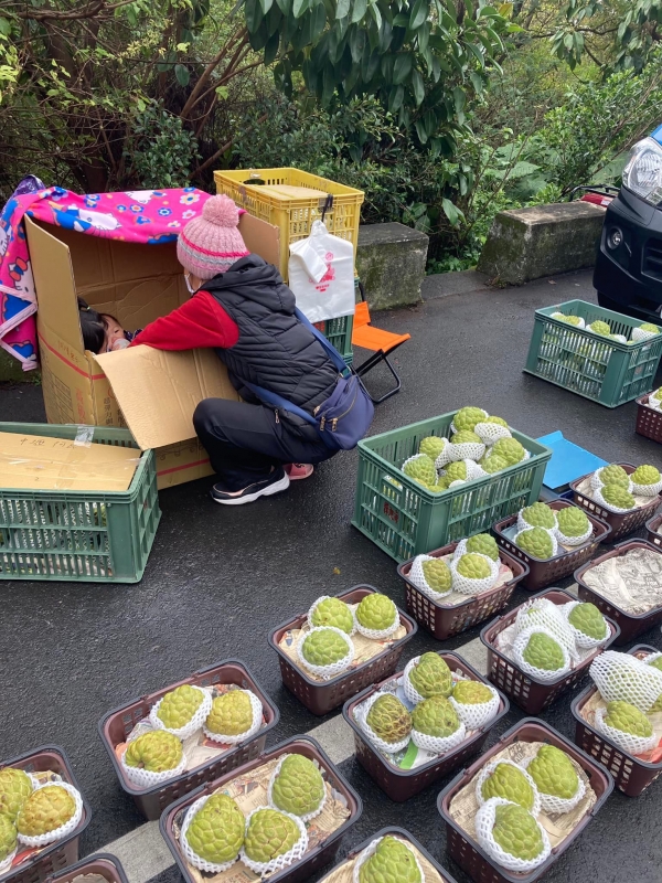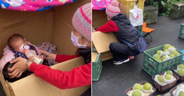 只見紙箱裡頭躺了一個小嬰兒,媽媽為了怕孩子著涼,特地在紙箱上頭蓋毯子,然後就蹲在箱子旁邊用奶瓶餵奶喝。看到這一幕,讓她真的很心酸很難過,於是也馬上買了2箱釋迦捧場!