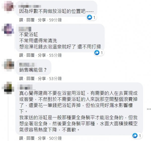 留言串中,一派過來人認為,浴缸相對不實用,「真的不是很實用,除了冬天根本不會想用,