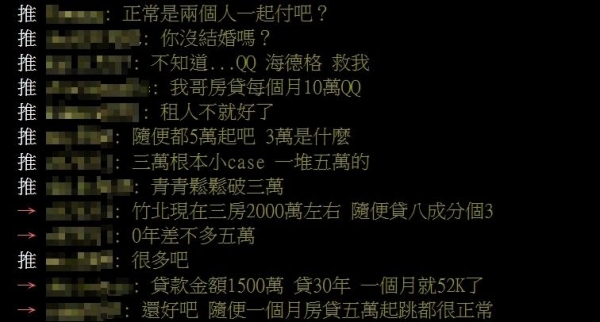 網友留言直接打臉原PO,「輕輕鬆鬆破三萬好嗎」、「正常是兩個人一起付吧」、「隨便都5萬起吧,3萬是什麼」、「竹北現在三房2000萬左右,隨便貸八成分個30年差不多五萬」、「4、5萬正常,3萬以下很少見」、「低於三萬才是少數+1」。