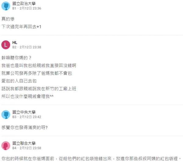 發文一出立刻掀起網友熱議,紛紛留言回應:「孝死我了」、「自己也愚孝,怪誰」、「你知道只能年年多給,不能少給嗎」、「把錢送人花,你媽真的很有面子」、「甘願做歡喜受」、「所以你很享受大把包紅包的感覺嗎?不然不包,他們能拿你怎樣」。