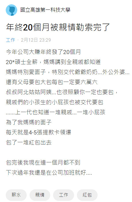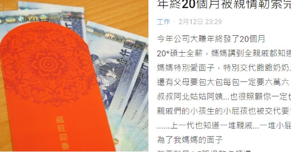不僅如此,媽媽甚至要求他還要包給叔叔、大伯、姑姑和阿姨「他們也很照顧你,你一定要包!」,他原本也沒想太多,想說包給長輩們是合理的,怎料媽媽最後更加碼交代親戚的小孩們也要包,讓他每天都帶著4、5張提款卡出門,過年不斷地發紅包,也讓他原本有20個月的年終,只剩不到一個月的錢.....讓他感嘆自己被情緒勒*索了,更表示:「包完後,我現在連一個月都不到,下次過年我還是在公司加班就好...」