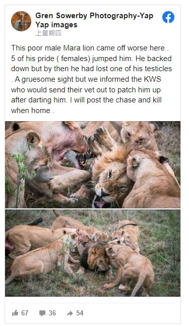 肯亞一頭公獅日前因試圖搶奪食物,因此被母獅群狠咬,痛到倒在地上不斷哀號,最後因傷勢太嚴重,一顆睪丸被切掉。攝影師格林(Gren Sowerby)表示,目睹了公獅與母獅群戰鬥的過程感到非常震驚,就像是在看一場F1賽車。