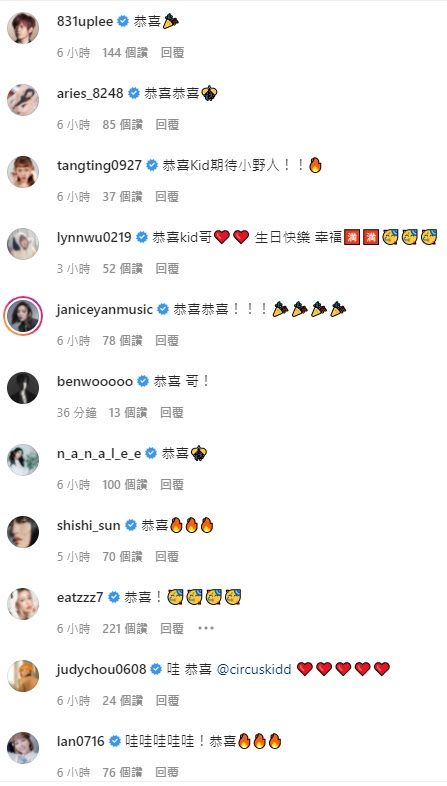 KID貼文僅隔短短6個多小時,就吸引超過16萬人按讚關注,不少演藝圈好友也紛紛在底下留言,包括坤達大讚「帥到爆」、峮峮(吳函峮)敲碗「期待小野人,恭喜」、李佳穎「幸福就是吵吵鬧鬧OK啦!」