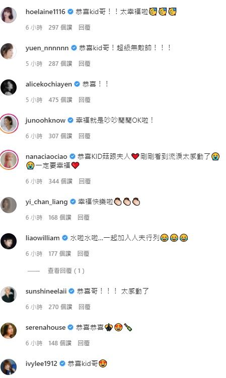 、威廉「水啦水啦…一起加入人夫行列」、焦凡凡「野小孩不嫌多」,柯佳嬿、李易、艾薇、王陽明、邵雨薇、毛弟、李千娜、小樂(吳思賢)、張立東、吳姍儒等人都獻上祝福,至今已經有超過130個藍勾勾帳號留言祝福,呈現出難得一見的超狂景象,也間接展現他多年來在演藝圈累積的好人緣。