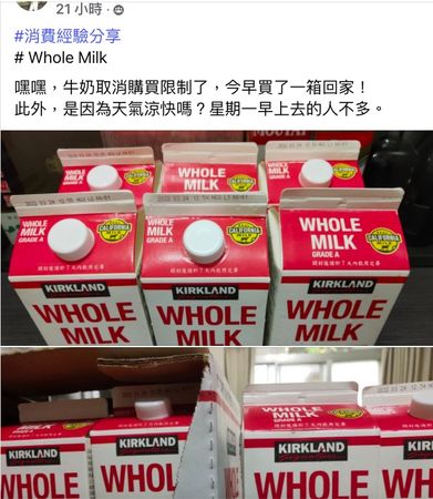 網友在臉書社團「COSTCO 好市多 消費經驗分享區」發文,指出「「嘿嘿,牛奶取消購買限制了,今早買了一箱回家!此外,是因為天氣涼快嗎?星期一早上去的人不多。