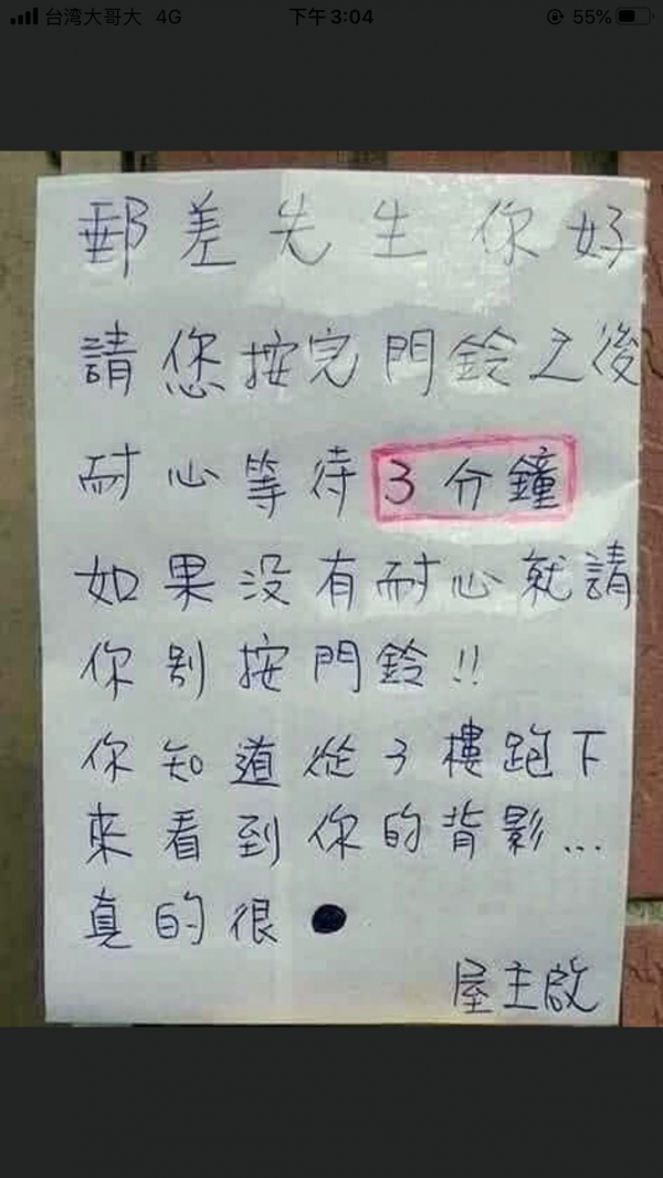 「我老家的郵差早就不按鈴了,都門口喇叭喊一聲幾號掛號就直接騎往下一戶。」,但也有人說還是有很認真的郵差「我家這邊的郵差嗓門很大,還會喊好幾次等人下來拿」、「真感謝我家這裡的郵差,電鈴壞了還打電話問我要不要下來收,我說我人不在,郵差說,明天同個時間會在嗎?我說應該在,郵差說那我明天到了再打給你!」。