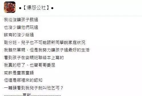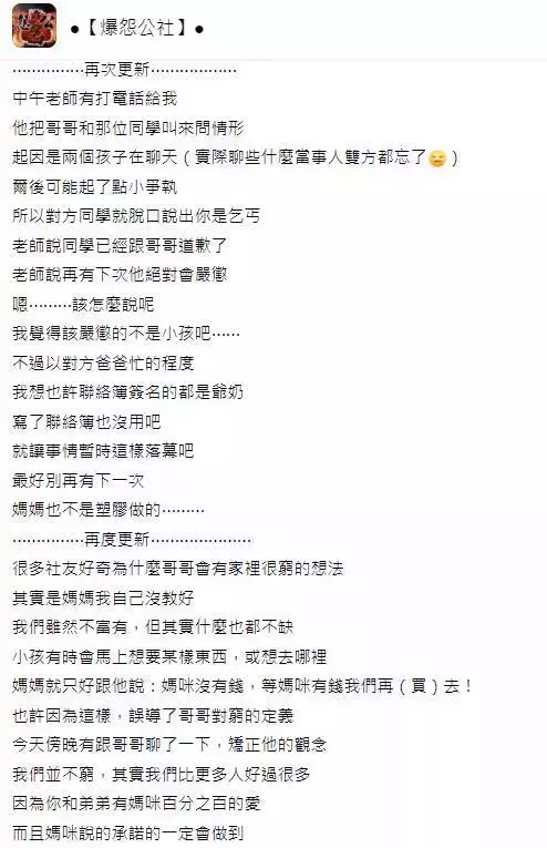 這名單親媽媽在臉書社團「爆怨公社」發文說,雖然單親,但她也努力地讓孩子過最好的生活,誰知大兒子開學不到一星期,已經被前座同學說是「乞丐」,但該名媽媽指每位同學也只是短短認識數天,不可能與新同學談起家庭狀況,而兒子被連續說了「乞丐」後,也沒有告知老師,只是默默的寫下 :「因為家裡窮,所以在學校有人說我是乞丐!」這讓她相當難受,也順勢開導了孩子。於是她便決定到學校向老師了解狀況,以防日後兒子再被說是「乞丐」。
