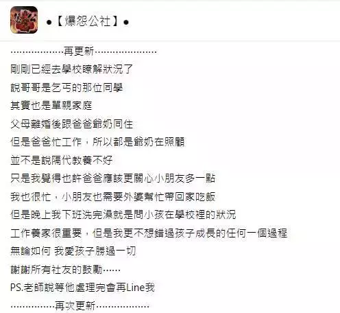 她也馬上連絡老師了解狀況,經了解後,原來該名喊兒子「乞丐」的同學也同樣來自單親家庭,他父母離婚後,便與爸爸、爺爺奶奶同住。不過,疑因爸爸工作繁忙,所以該名同學大多時候都是由阿公阿嫲照顧,同時她也認為該名同學的爸爸應該更加關心小朋友,並指出自己其實也很忙,孩子平時也需交由阿嫲照顧,但自己下班回家後,首要關心的便是孩子在學校的狀況,這才讓她決定讓事情到此結束,不想再繼續追究,不過也坦言: 「我覺得也許爸爸應該更關心小朋友多一點,工作養家很重要,但是我更不想錯過孩子成長的任何一個過程。」
