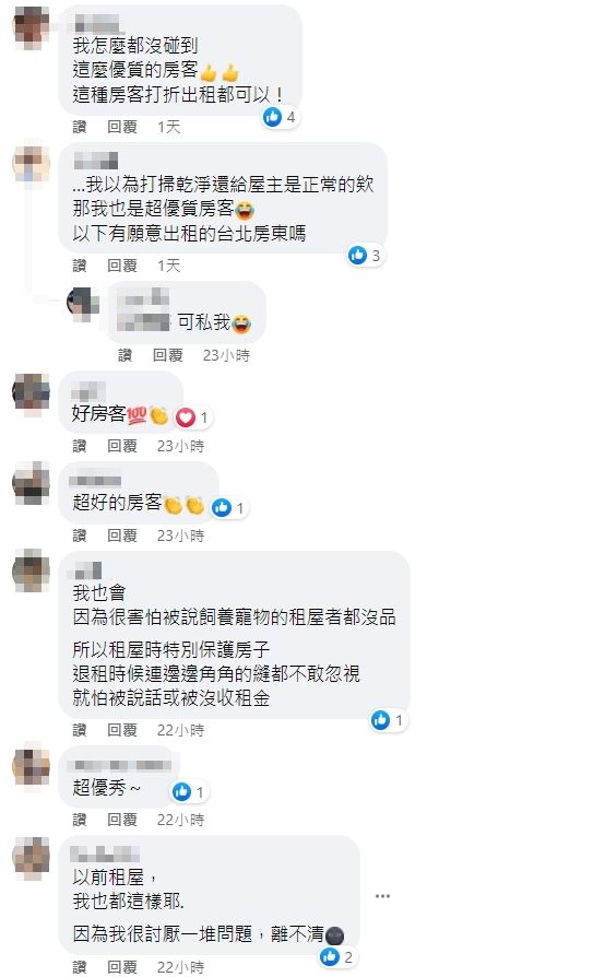 文章曝光後,底下網友不禁讚嘆,「這種房客,可遇不可求」、「乾淨到太不真實了,好像剛搬進去一樣,妳太猛」、「遇到這麼好的房客,房東真的要覺得三生有幸了,整理這麼乾淨,實質難得」、「可惜我台中房子自住,不然這麼好的房客一定要搶的啊」、「有這種房客,我願意折扣出租給你」、「太離譜了吧,跟沒住過一樣」。