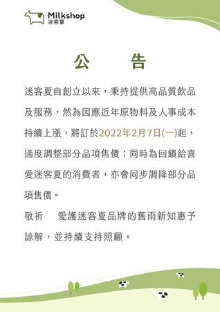 迷客夏指出,在謹慎評估後規畫調整部分商品價格,經典綠光鮮奶系列飲品維持凍漲,以單茶、拿鐵及手作特調系列部分飲品作為調整品項;調降品項則包含養樂多綠、冰糖洛神梅 、嫩仙草凍奶等北部價格,及出雲抹茶鮮奶全區調降。