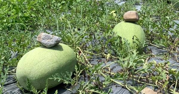 根據《ETtoday新聞雲》報導,這位網友在臉書「爆廢公社二館」中貼出了幾張照片,只見一大片的西瓜田中,種植了許多份量十足、顏色鮮豔的大西瓜,但是仔細觀察,就可以發現幾乎每個西瓜上,都放了1、2顆石頭,而且都是在瓜體的正中央,於是原PO忍不住考考大家,寫道:「好美的西瓜田!但你們知道嗎,西瓜上面為什麼要放石頭呢?今天長知識了!」