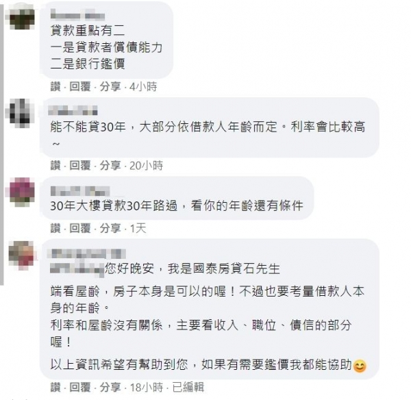 貼文曝光後,立刻就有網友點出銀行放貸重點其實並不在於屋齡,「貸款重點有二,一是貸款者償債能力,二是銀行鑑價」、「能不能貸30年,大部分依借款人年齡而定」、「30年大樓貸款30年路過,看你的年齡還有財力條件」。