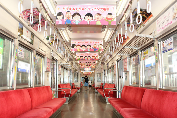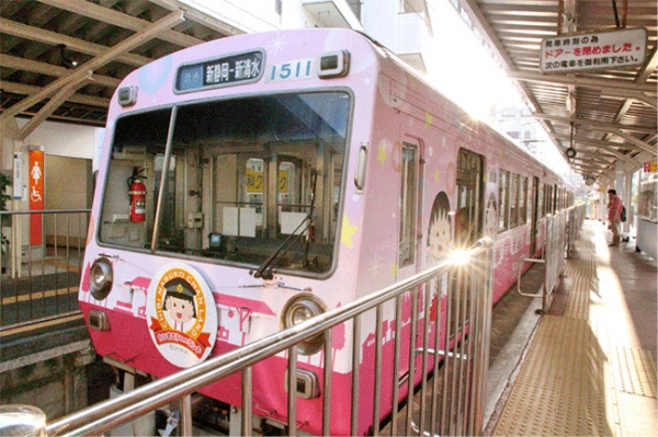 小丸子彩繪列車外觀為醒目的櫻花粉,同時漫畫中耳熟能詳的角色如小丸子、小玉、野口、花輪等,在車廂外觀都看得到;除了外觀外,車廂內也有滿滿的小丸子元素,如吊環能看到小丸子的經典表情裝飾,到站廣播由小丸子播送,因此成為旅客拍照打卡必拍的景點。