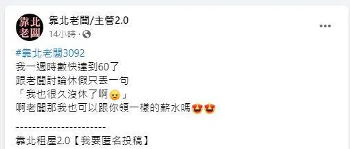 原PO在臉書《靠北老闆/主管2.0》上發文提到「我這一週上班時數快達到60(小時)了,跟老闆討論休假,他卻只回我一句『我也很久沒休了啊』」。