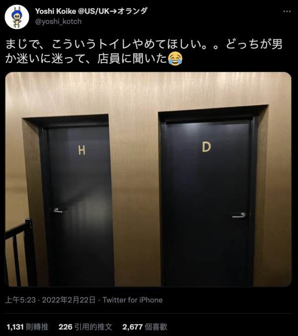 根據《三立新聞》報導,一名旅居英美多年的日籍網友Yoshi Koike,日前在個人推特「@yoshi_kotch」上分享一段糗事,只見他曬出一張荷蘭的廁所門照片,門上只標示「H」、「D」2個英文字母,第一次看到的他區分不出來哪個是男廁,沒有其他圖案或顏色解惑,不敢隨意開門的他,只能尷尬求助現場餐廳員工。