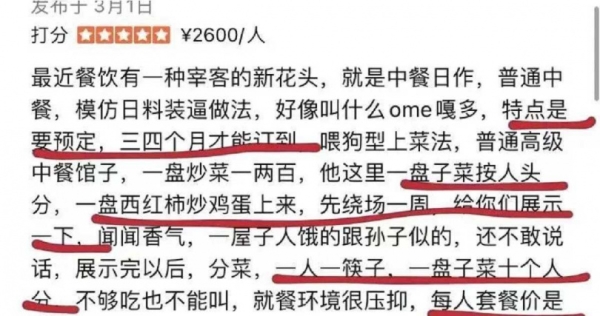 ▼還有顧客表示,「中餐日作」的用餐規矩非常多,如果廚師不高興,隨時都可能撒手離場,讓顧客感受到相當大的壓力。還有人批評餐廳的「餵狗型上菜法」,舉例來說,一盤番茄炒蛋上桌前會先繞場一周,展示一下,讓大家聞聞香味,「一屋子人餓得跟孫子似的,還不敢說話」。一盤菜餚10個人分,不夠吃也不能叫,環境非常壓抑。