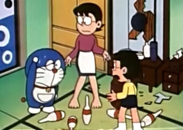 順帶一提,除了看電視,哆啦A夢也會沒事找事自己找樂子消磨時間,比如有一集他就在家裡玩起了保齡球,結果給鏡子打碎了...