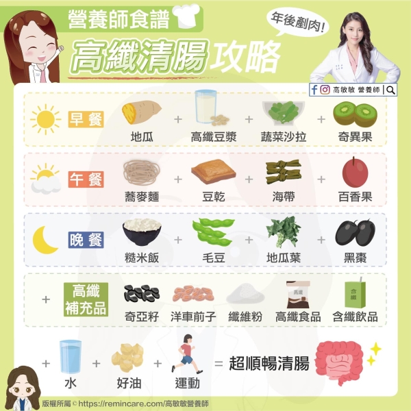 營養師高敏敏曾指出,便秘嚴重、上廁所太用力,可能引發心肌梗塞,尤其是長者、血液循環差或本身患有高血壓、心血管疾病者更要注意。因此她分享「高纖清腸攻略」獨家菜單一次看,照著吃和宿便說掰、輕鬆甩肉無負擔。