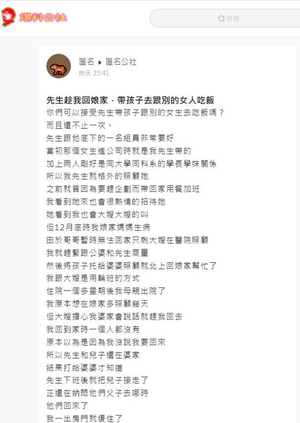 人妻在論壇《匿名公社》發文詢問:「你們可以接受先生帶孩子跟別的女生去吃飯嗎?」人妻表示老公有一位大學同系學妹,兩人先後進同家公司,身為前輩和學長的老公也特別照顧學妹。