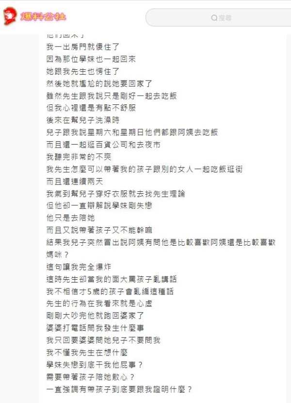 原PO後來幫兒子洗澡時,兒子表示週末兩天爸爸都帶她和阿姨去吃飯,還逛了百貨公司和夜市。