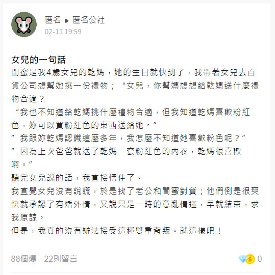 此時4歲的女兒懵懂說出所見所聞:「因為上次爸爸就送了乾媽一套粉紅色的內.衣,乾媽很喜歡啊!」人妻頓時晴天霹靂,因為她知道女兒沒有說謊。