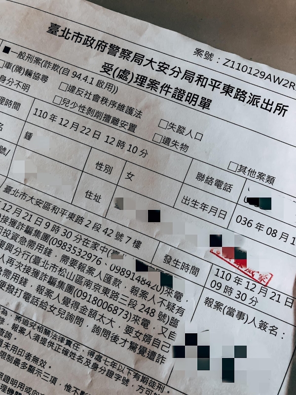 我立即陪著媽媽到警局報案,因媽媽年事已高,辛苦存下的155萬被詐騙匯出,一直哭泣自責,看了實在很心疼。