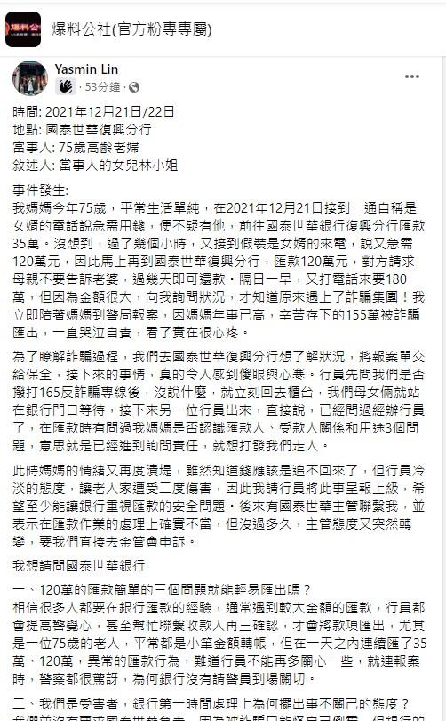 我媽媽今年75歲,平常生活單純,在2021年12月21日接到一通自稱是女婿的電話說急需用錢,便不疑有他,前往國泰世華銀行復興分行匯款35萬。