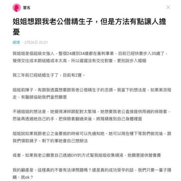 誰知原PO姐姐日前突然提議想和妹夫「借精生子」,她心想若是按照醫生建議流程當然不是問題,結果姐姐認為凍卵和配對過程太繁瑣,想直接拿妹夫用過的套套「反過來推到自己體內」藉此受孕,或者靠妹夫自己DIY收集精.液,到手她會自己想辦法。