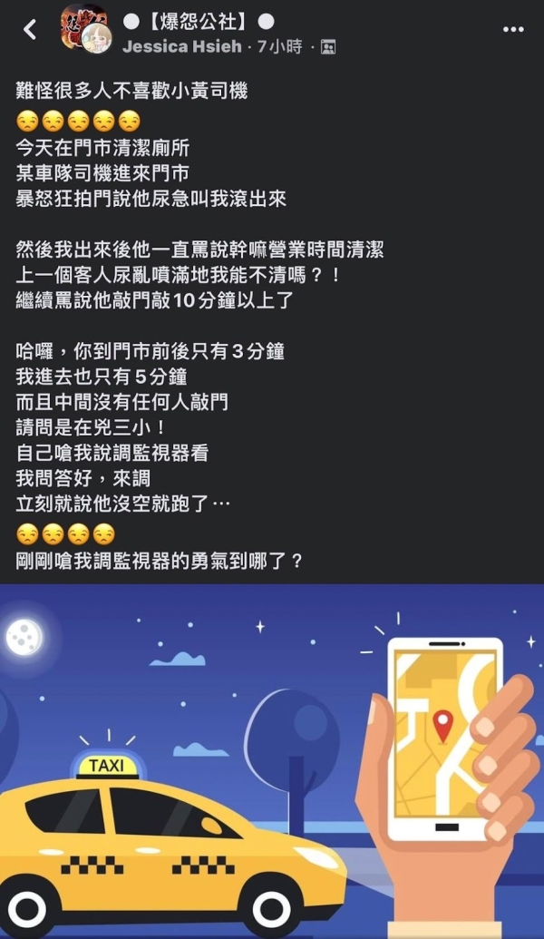 今天在門市清潔廁所,某車隊司機進來門市「暴怒狂拍門」說他尿急叫我滾出來……