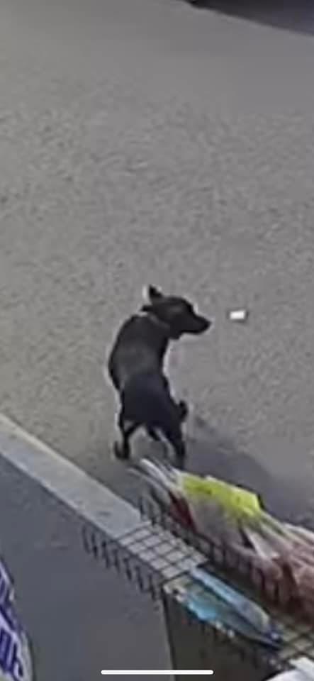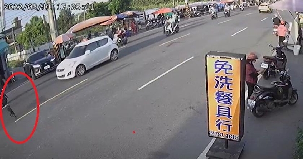影片中有隻黑色小狗跑到路邊的攤位前,被攤位老闆驅趕,牠立刻轉身穿越馬路跑到對面,結果一台汽車急煞,導致後面的機車煞不及直接倒頭栽!