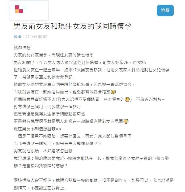 一名女網友以「男友前女友和現任女友的我同時懷孕」為題寫下,自己目前與現任男友交往一兩個月的時間,同時也提及,彼此在交往的期間也有進行親密行為,並且表示,雖然過程中都有做好安全措施,但卻疑因品質不好而導致自己目前懷孕一個月。
