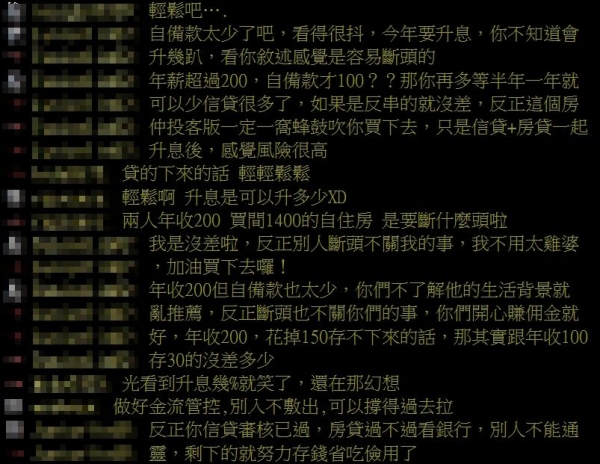 文章貼出後,底下網友兩派熱議,「做好金流管控,別入不敷出,可以撐得過去拉」、「反正你信貸審核已過,房貸過不過看銀行,別人不能通靈,剩下的就努力存錢省吃儉用了」、「妳繳信貸,老公辦房貸,我是覺得沒啥問題」、「不含獎金年收200萬,除非工作不穩,否則很輕鬆吧」。