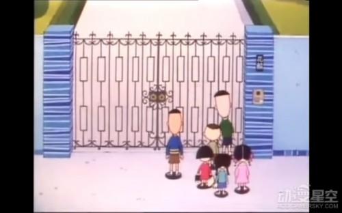 截了幾張小丸子第一次去花輪家玩兒的圖。他們集體去花輪家參觀,70 年代的小孩第一次看到閉路電視門禁(右邊欄杆):