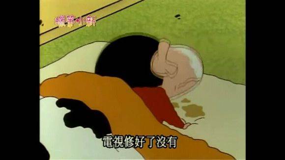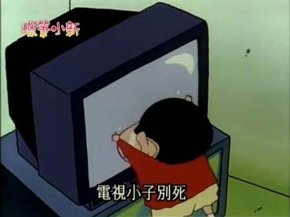 4、家裡的電視機壞了(其實是她媽媽修壞了),小新不能看他最喜歡的《動感超人》了,他留下了傷心的眼淚。