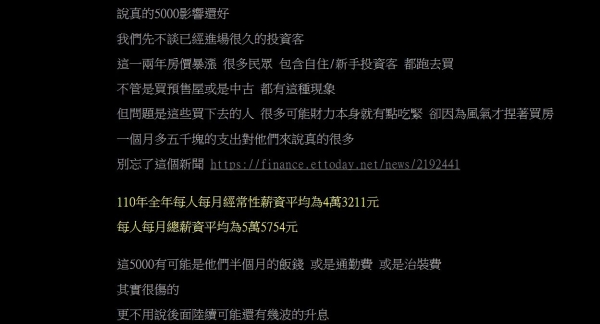 其中,更有網友感嘆指出,這一兩年房價暴漲,很多民眾都一股腦捏著買下去,不管是買預售屋或是中古都有這種現象,但問題是這些捏著買下去的人,可能財力本身就吃緊,一個月多5000元支出對他們來說真的很多。他同時拿出行政院主計處上個月公布數據指出,110年全年每人每月經常性薪資平均為4萬3211元,每人每月總薪資平均為5萬5754元,「這5000有可能是他們半個月的飯錢或通勤費,很傷的」。