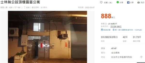 ▲根據網路賣屋平台資訊,這戶台北市士林區通河西路二段住家,開價僅888萬求售,換算單價僅2字頭。(圖/翻攝自591)