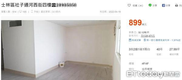 ▼根據網路賣屋平台資訊,同樣位於台北市士林區通河西路二段的住家,開價899萬求售。(圖/翻攝自591)