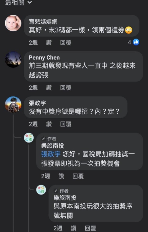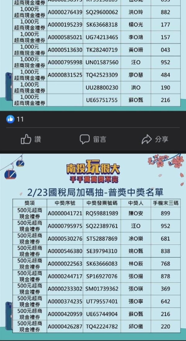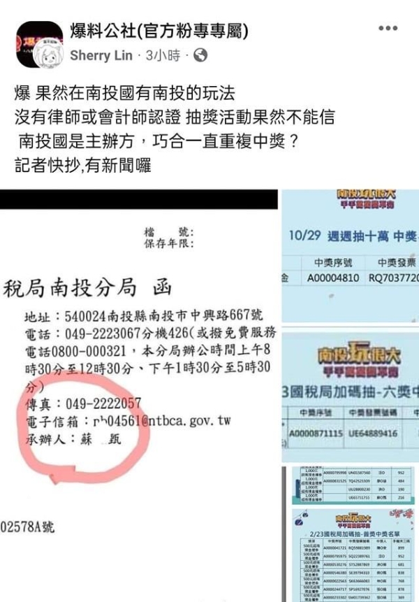 網友Sherry Lin就在爆料公社發文,因為他從得獎名單上看到有相同名字的,手機末三碼也相同,讓他不禁懷疑為何得獎的都是同樣的人,而且更讓他不平的是,對方還?『果然在南投過有南投的玩法,沒有律師或會計師認證,抽獎活動果然不能信,南投國是主辦方,巧合一直重複中獎?記者快超,有新聞囉』