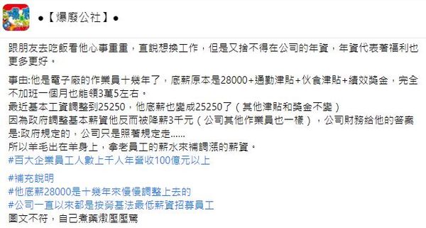 原PO在臉書「爆廢公社」的文章中提到,跟朋友相約聚餐,對方卻心事重重,一直說想換工作,但又捨不得年資,畢竟年資越高代表福利更多,仔細一問才知道,原來朋友在電子廠擔任作業員十多年了,底薪是2萬8000元(十多年來慢慢調整上去的),加上通勤津貼、伙食津貼、績效獎金等等,完全不加班一個月也可以領到3萬5000元左右。