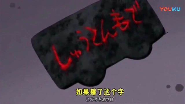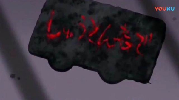 阿呆似乎想到了什麼,在口袋翻出小新找到的黑色石頭,將灰塵擦乾淨發現上面有血紅的四個字「直到終點」