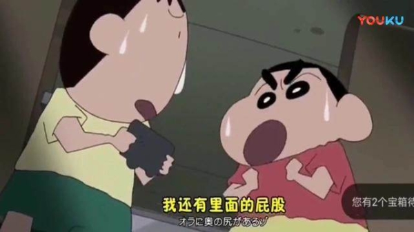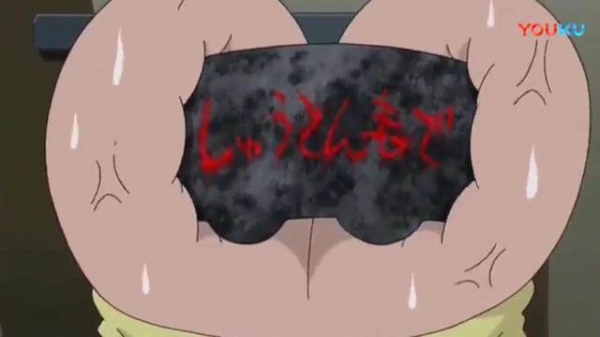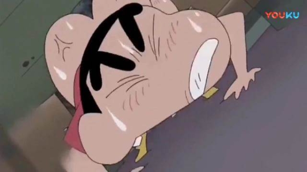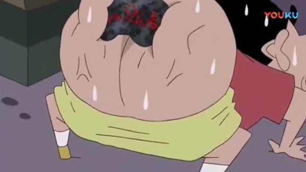 小新使出自己的絕招,用pp搞定一切不可能的事情,小新試圖用他強有力的屁股將方塊石頭壓斷。