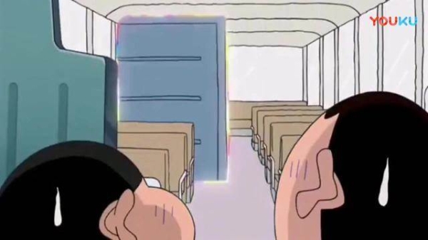 車門自動打開,小新上車才發現氣氛有些不對勁,車裡所有的人表情都呆呆的,而一直很呆的阿呆反而鮮活的很多。阿呆都不呆了,這時候你就要考慮是不是出問題了呀小新!