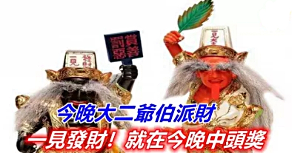 讓你發到大紅大紫 迎大二爺伯,財運與你不離分;大二爺伯賜你金元寶,金玉滿堂和瑪瑙; 隨心所欲買萬字,張張大獎中到老;快樂幸福來築路,財氣擋都擋不住; 煩惱憂愁皆出逃,路路財源滾滾到;生活甜蜜身體好,財源茂盛多歡笑;