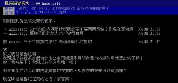 原PO說,「原來我爸是魯蛇啊!我還誤以為我爸當個台北市公車司機還能買間台北市內湖的房就算pr99了勒!我被騙了!我還以為他有多強!如果30年前台北市的內湖是魯蛇在買的,那現在的魯蛇可以買哪裡?現在哪裡是魯蛇在買的地方?」