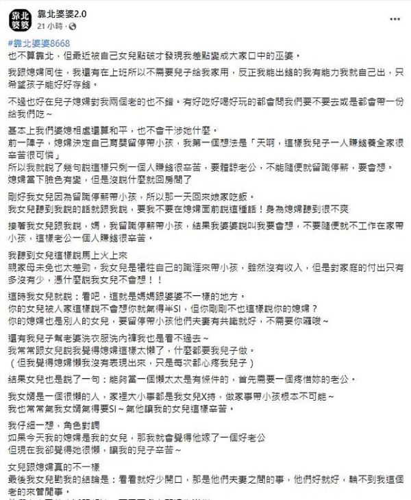 一位婆婆在臉書《靠北婆婆》上發文反省「我差點變成大家口中的惡婆婆,目前還和兒子媳婦同住,平時相處都算不錯,但最近媳婦說想請育嬰假,我第一個想法是『天啊,這樣我兒子一人賺錢養全家很辛苦很可憐』」。