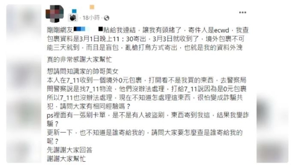 事後原PO也補充,她他根據寄件人資訊及包裹寄出時間查詢後,推測該包裹是盲包,「亂槍打鳥方式寄出,也就是我的資料外洩」。事實上,類似詐騙手法猖獗,提醒民眾若要取貨,務必確認是自己購買的,千萬別領取來路不明的包裹。