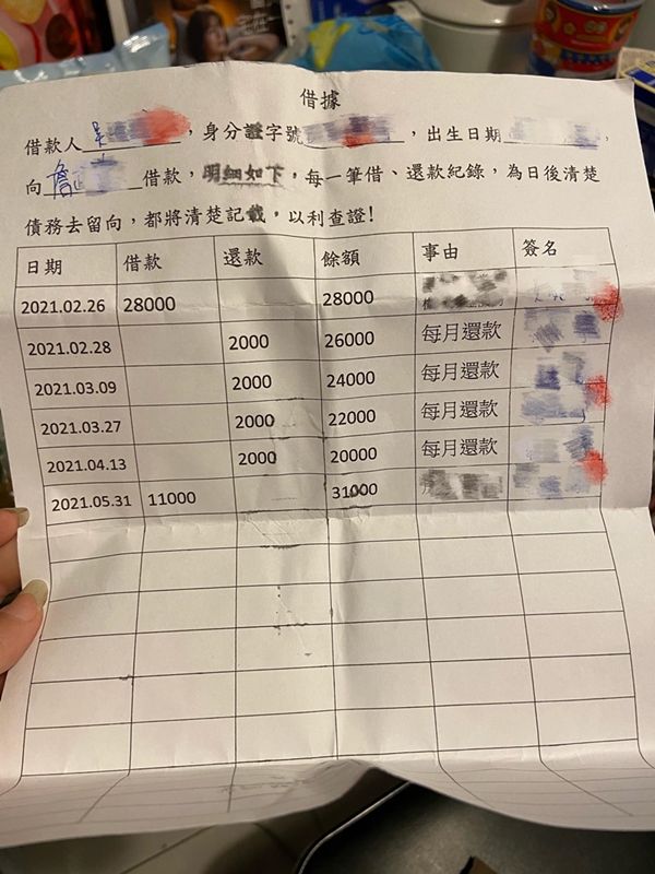 ▼2人借貸時有立借據,但媽媽PO文詢問時,將欠款事由遮住,因此外人不曉得欠錢的原因微合。(圖/翻攝臉書/爆系知識家)